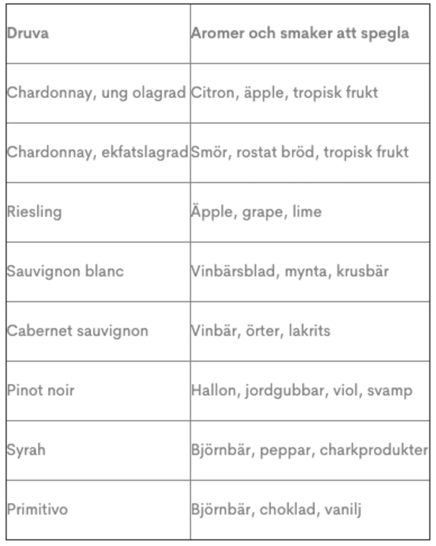 När du har hittat ett vin som balanserar grundsmakerna i maten på ett bra sätt kan man höja nivån och försöka hitta aromer i vinet som kan spegla smakerna i maten. På detta sätt förstärker du smakerna och lyfter hela upplevelsen. Det allra enklaste sättet är att använda det vin som du tänker servera i själva matlagningen, i grytan eller såsen till exempel. Men du kan också hitta olika aromer i vinet som du kan spegla i exempelvis olika tillbehör. En smörig chardonnay från Bourgogne och smörsåsen buerre blanc är en klassisk kombination. Ska du servera en cabernet sauvignon med sina tydliga vinbärstoner är det inte fel med en sked vinbärsgelé i såsen. Listan på aromer och smaker att spegla kan göras hur lång som helst men här kommer några av de främsta druvorna och vanliga dofter som de brukar förknippas med.