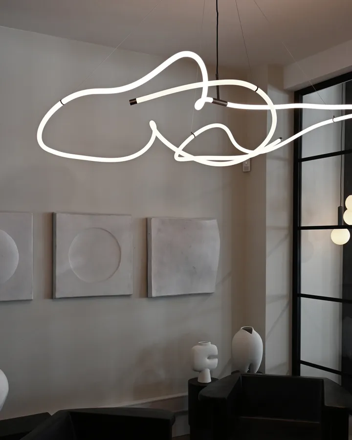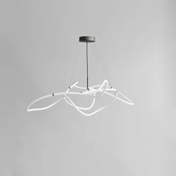 Ghost Chandelier big taklampa från 101 Copenhagen är en modern och minimalistisk taklampa som blir lika mycket skulptur som lampa i ditt hem. Ghost chandelier är en riktig statement-lampa med ett grafiskt och konstnärligt uttryck där lampans form upplevs olika beroende på från vilken vinkel du betraktar den. Den inbyggda led-ljuskällan ger ett behagligt varmvitt sken och hålls uppe av fyra vajrar i rostfritt stål som du även gör det möjligt att justera hur långt från taket du vill att lampan ska hänga.