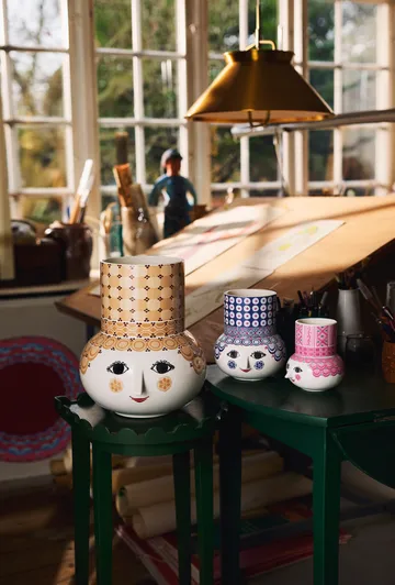 Olga vas 15 cm från Bjørn Wiinblad är tillverkad av glaserad keramik och prydd med färgglada dekaler som fångar Wiinblads ikoniska stil. Den 15 cm höga vasen kombinerar konst och funktion, perfekt för att sätta färg på vardagen och lyfta fram din kreativitet.