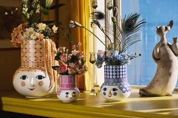 Olga vas 35 cm från Bjørn Wiinblad är en elegant keramikvas som bär Wiinblads lekfulla designtradition vidare. Det klassiska ansiktet och de mandelformade ögonen förstärker det konstnärliga uttrycket, medan den generösa höjden på 35 cm gör den perfekt för större buketter och dekorativa arrangemang.