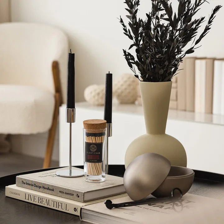 Stora Eldstickan från Eldstickan är en elegant tändsticksask med ca 100 braständstickor av asp, perfekt för att tända brasor eller ljus. Tändstickorna kommer i en 15 cm hög, stilfull glasbehållare med ett praktiskt korklock, vilket gör den både funktionell och dekorativ. Med plån på etiketten är den enkel att använda och blir en naturlig del av ditt hem. Kombinationen av glas, kork och trä skapar en tidlös design som tillför både stil och praktisk användning.