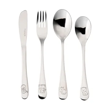 Eternum barnbestick är ett charmigt bestickset i rostfritt stål som gör varje måltid roligare för barn. Lekfulla djurmotiv pryder kniv 17,6 cm, gaffel 17 cm, matsked 16 cm och tesked 14 cm. Ytan är högblank och slitstark i 18/0 stål som tål flitig användning. Formen ger ett stabilt men lätt grepp för små händer och uppmuntrar självständigt ätande. En hållbar present som kombinerar funktion, säkerhet och glädje vid matbordet. Passar vardag och helg och blir snabbt en favorit i köket.