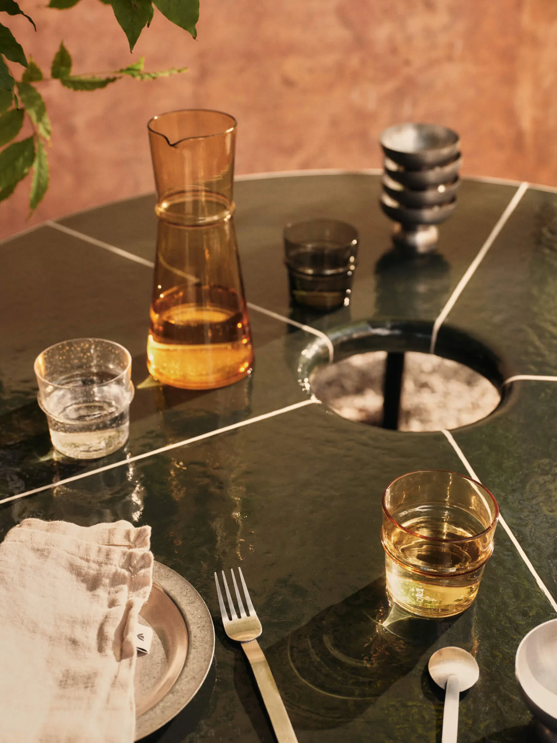 Boya karaff från Ferm Living är munblåst i 100 % återvunnet glas med en mjuk och tidlös siluett. Glaskaraffen är inspirerad av antikt Medelhavsglas och har en rundad detalj kring halsen som ger ett stabilt grepp vid servering av vatten, juice eller saft. Det klara glaset framhäver dryckens färg och gör karaffen lika fin på matbordet som på serveringsbrickan. Den eleganta formen skapar en harmonisk dukning och passar både vardag och fest. En hållbar karaff i återvunnet glas som kombinerar funktion och skandinavisk design.