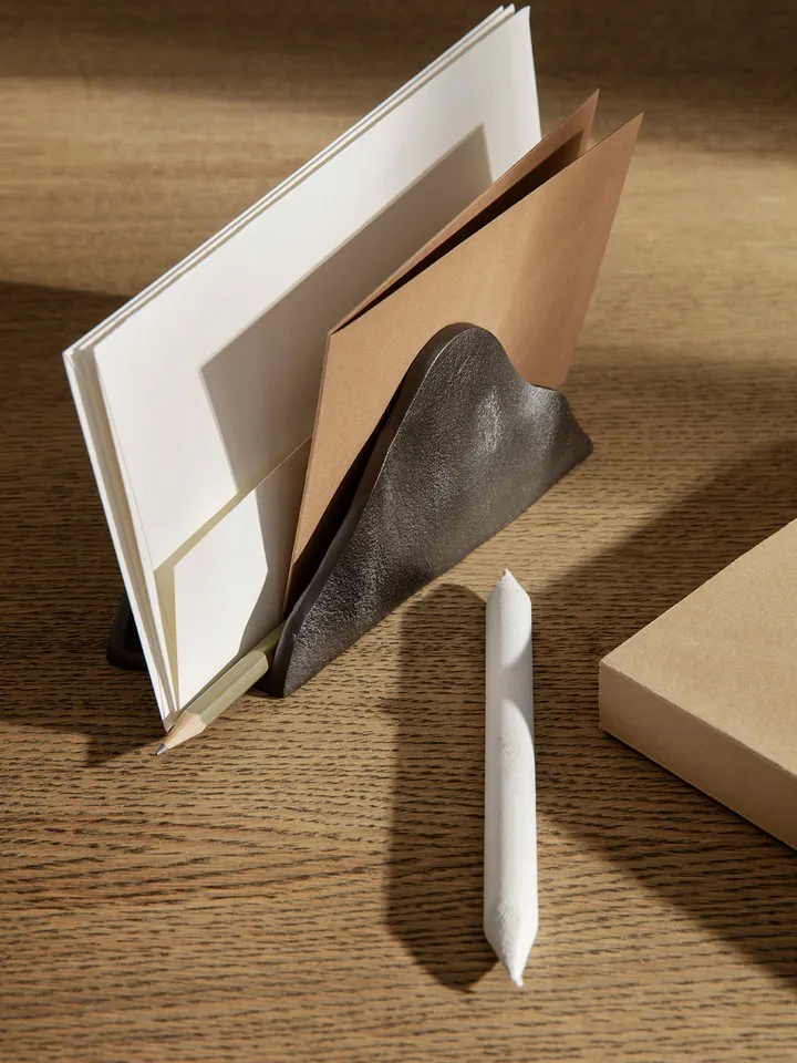 Yama brevställ från Ferm Living är ett skulpturellt och samtidigt praktiskt inslag i hemmet, inspirerat av vilda, otämjda landskap. Formgivet med en organisk siluett fungerar det lika bra vid hallbyrån för post och kvitton som på köksbänken för servetter eller i arbetsrummet för brev och anteckningar. Det robusta utförandet ger stabilitet samtidigt som formen bidrar med en konstnärlig detalj som lyfter din inredning och gör vardagens små sysslor lite trevligare.