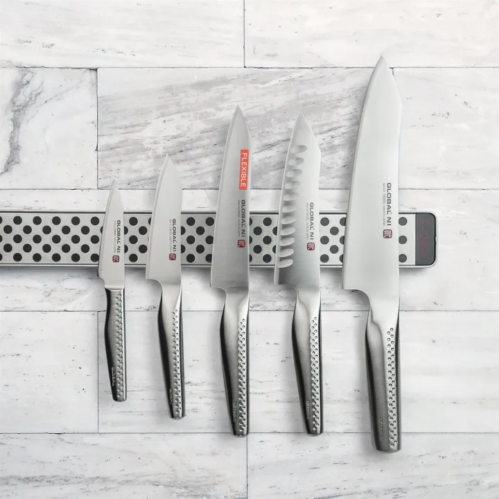 Den smidiga skalkniven från Global NI-serien är tillverkad i det slitstarka materialet CROMOVA-18. Serien är framtagen av Komin Yamada som sätter stort värde i kvalitet och design. Tack vare detta har denna skalkniv fantastiska egenskaper som förenklar köksarbetet. Bladet är tillverkat i ett stycke och har dessutom ett extra lager CROMOVA-18 för att vara så vass och stark som möjligt. Handtaget är något större än de vanliga Global-knivarna vilket gör att den vilar tryggt och stabilt i handen.