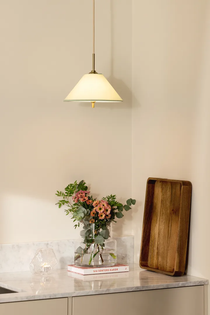 Iris pendel 25 från Globen Lighting har en handgjord skärm i bomull som tillsammans med eleganta mässingsdetaljer skapar ett mjukt och harmoniskt uttryck. Den dolda ljuskällan bakom ett bländskydd i bomull sprider ett behagligt sken, perfekt över matbordet eller i sovrummet. Med sin pärlemorfärgade textilkabel blir lampan ett vackert smycke i rummet – lika dekorativ som funktionell.