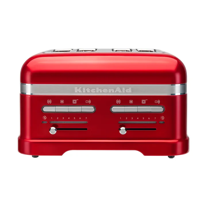 Artisan brödrost 4 skivor från KitchenAid är tillverkad av gjutet aluminium och är perfekt för stora frukostar. Med sina fyra extra breda fack som automatiskt för ner och centrerar brödet kan du enkelt ställa in rostningsgrad i sju steg och få perfekt rostat bröd varje gång. Till denna modell ingår även en smörgåshållare i rostfritt stål som gör det enkelt att grilla härliga toasts i din brödrost. Med en praktisk bagelinställning, upptiningsfunktion och varmhållning i upp till tre minuter täcker denna brödrost alla dina behov.