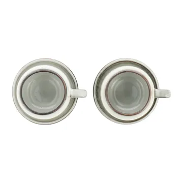 Amera espressokopp med fat från danska Lene Bjerre har en vacker formgivning med stor kupa och tillhörande fat medföljer. Koppens oregelbundna toner får den handgjorda känslan att framhävas på ett elegant sätt och espressostunden blir extra lyxig i en fin kopp som denna.