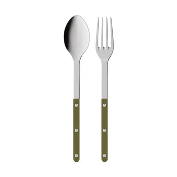 Bistrot solid serveringsbestick 2 delar från SABRE Paris är ett elegant set som lyfter varje dukning. Med en stor serveringsgaffel för kött och en generös sked för tillbehör får du funktion och balans i ett. Designen hämtar inspiration från klassiska bistroer med synliga nitar och tidlös form som känns både traditionell och samtida. Tillverkat i kvalitetsmaterial som ligger skönt i handen och tål flitig användning. Perfekt till vardag och fest och ett självklart komplement till övriga bestick i Bistrot-kollektionen. Idealisk för servering av sallader, gratänger och varma rätter.