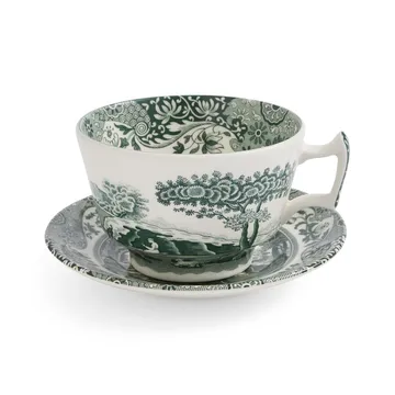 Heritage Green Italian kopp med fat från Spode är en elegant frukostduo i klassiskt porslin med det ikoniska landskapsmotivet i djupgrönt. Den tidlösa designen skapar en inbjudande servering och blir lika fin på frukostbrickan som på helgens brunch. Koppen passar för kaffe, te eller varm choklad, medan fatet ger ett harmoniskt helhetsintryck och fångar eventuellt spill. En uppskattad del av Heritage Green Italian som förenar samlarvärde, tradition och funktion i hemmets vardag.