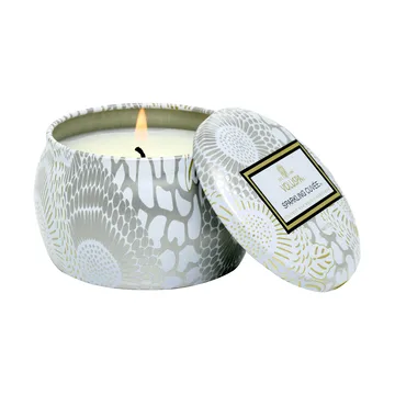 Japonica Mini Tin doftljus 25 timmar från Voluspa är ett stilrent doftljus i metall med lock som passar perfekt både hemma och på resan. Doftljuset i dekorativ plåtburk sprider en behaglig och balanserad rumsdoft som skapar en välkomnande känsla i vardagsrum, hall eller sovrum. Kokosvax av hög kvalitet i kombination med bomullsveke ger en ren, jämn låga och en brinntid på upp till 25 timmar. Den kompakta storleken gör ljuset enkelt att placera på mindre ytor eller ta med i väskan. En uppskattad present och ett enkelt sätt att addera stämning och doft till hemmet.